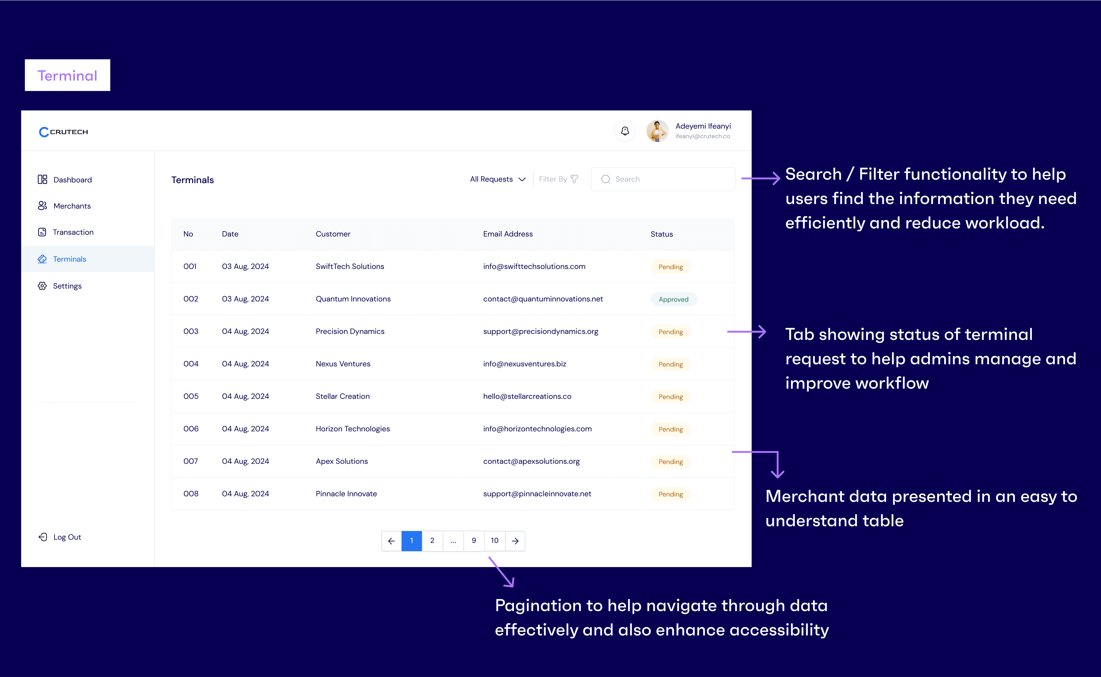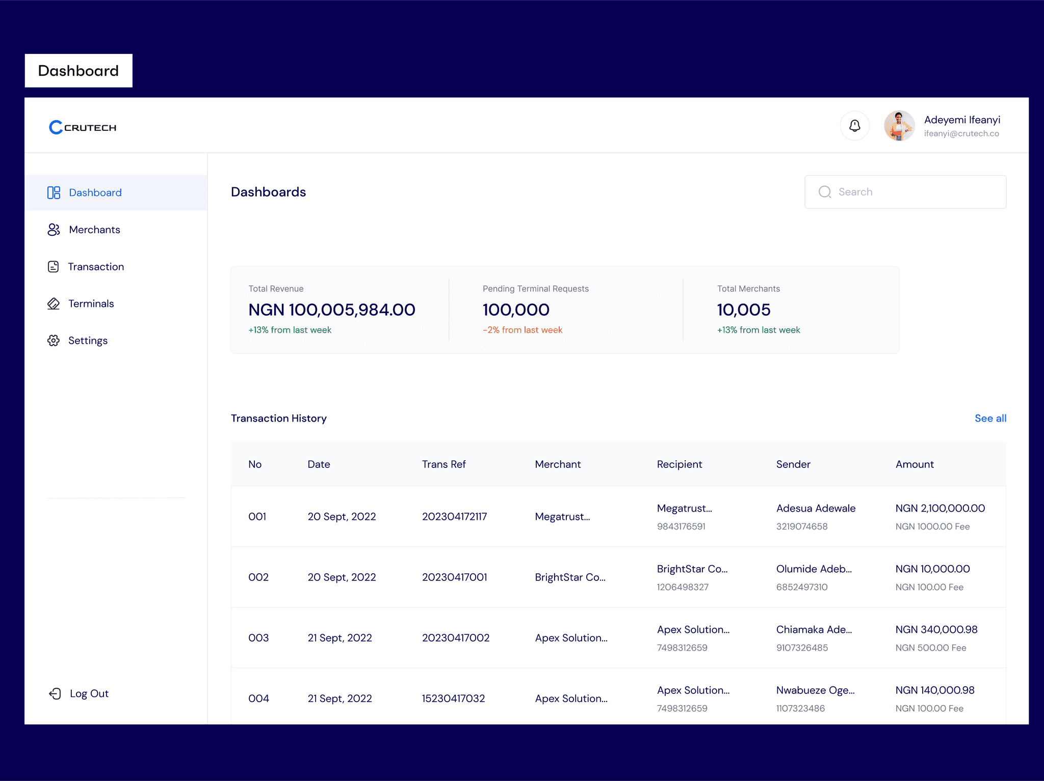 - Have a concise breakdown of merchants, pending requests, and total revenue from all merchant's accounts.