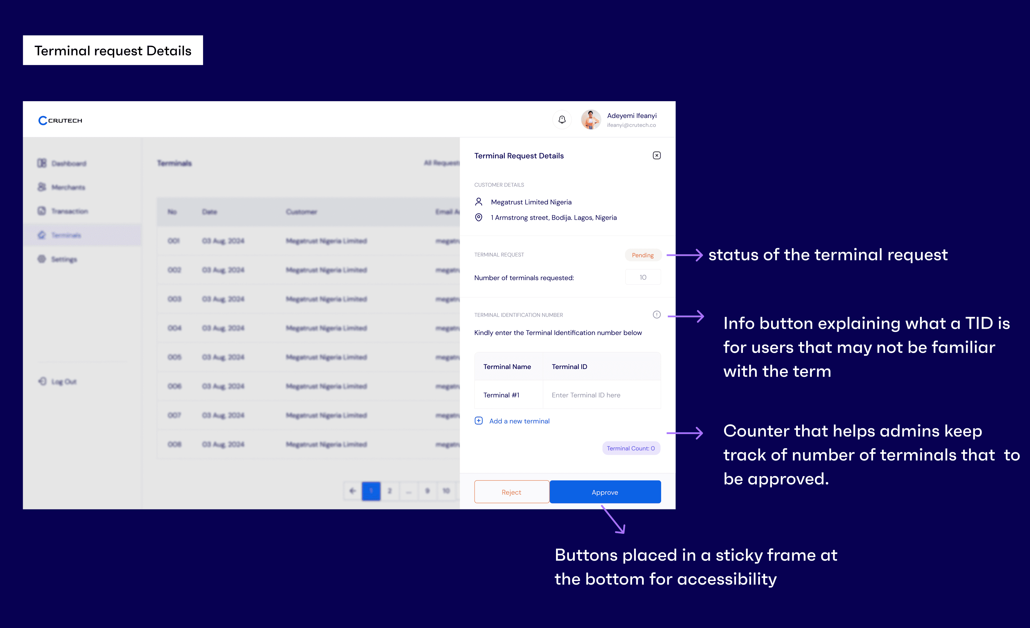 When a merchant requests a terminal through their account, the bank reviews and approves it, creating a unique terminal ID. At the same time, a virtual account number is automatically generated and linked to the terminal. This simplifies the process for bank staff and makes managing terminal accounts more efficient.